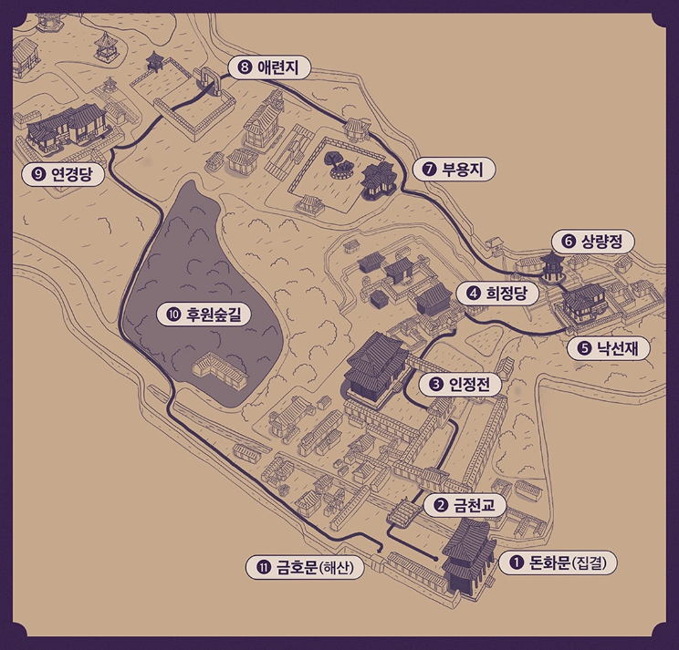 창덕궁 달빛기행 관람동선은 위의 사진과 같이, 1번 돈화문에서 집결해서 10번인 후원숲길까지 거니는 코스로 진행되는데요.
